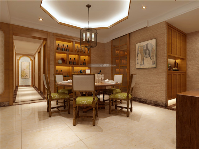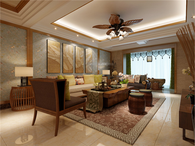 本案是充滿異域風情的東南亞風格裝修,用大膽的配色,濃厚的色彩,充滿自然氣息的家具、裝飾、線條打造富有熱烈、格調和美感的異域風情。其熱情、妖嬈、個性的美感,讓家呈現一種別具一格的家居特色。