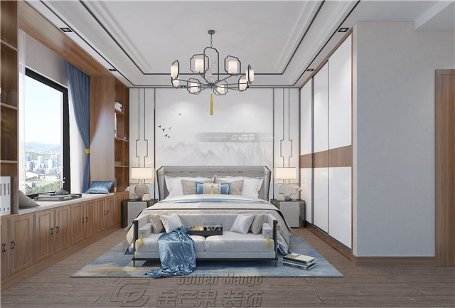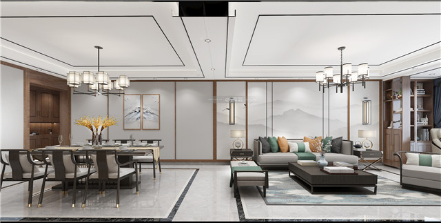 清爽的配色秀氣婉約,簡約的線條結合中式造型,展現現代時尚的簡潔和中式的高雅。藍白配色清爽宜人,秀麗的燈飾展現婉約端莊的中式美,遠山巍峨的意境將中式美更好的演繹。