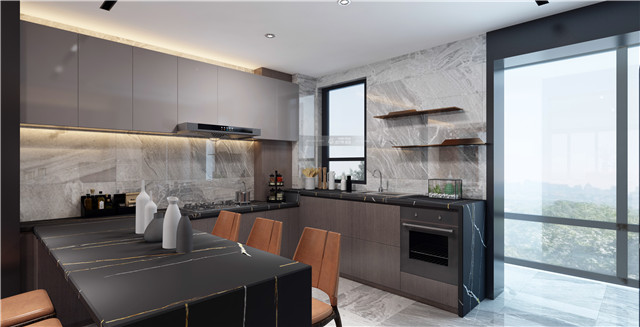 開放式廚房為空間注入更多的靈動性,一抹明媚的橙色,混合經典的高級黑,空間質感不言而喻。