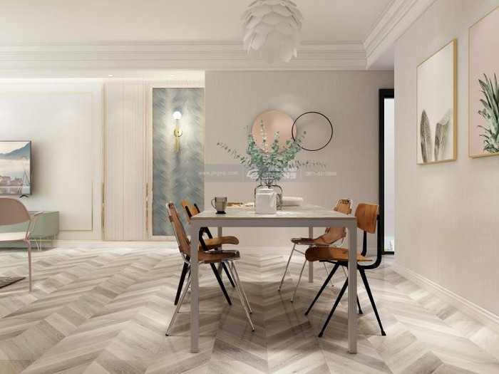 地板的紋理讓房間更加柔美和夢幻。墻上的粉色裝飾也是精致的小可愛。羽毛燈飾,仙氣飄飄,過處蹁躚。