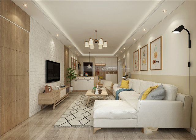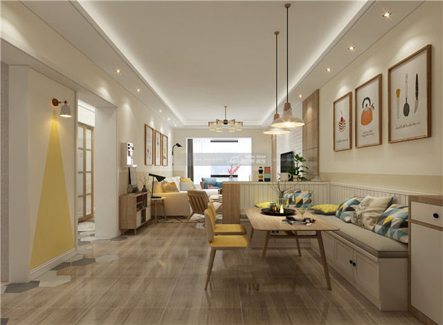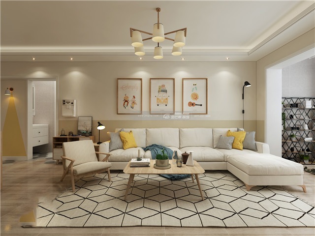客廳的色彩承襲了北歐風(fēng)格一貫的傳統(tǒng),溫暖的配色簡單大方,原木的應(yīng)用也在家具和墻板的呼應(yīng)中達(dá)到一個(gè)平衡。吊頂?shù)呐珶魩檫@個(gè)家更是增添一份溫柔。