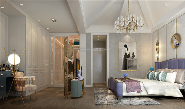斜斜的吊頂摒棄常規,營造宮廷般的尊貴大氣感。神秘優雅的紫色始終貫穿全屋,貴氣拿捏得恰到好處,不失家的舒適,又彰顯靚麗與神秘優雅。彰顯貴氣的地毯,傳遞著空間主人對奢雅生活的態度,貴氣的金屬裝飾,在光影的光耀之家,讓家變得高級而尊貴典雅。