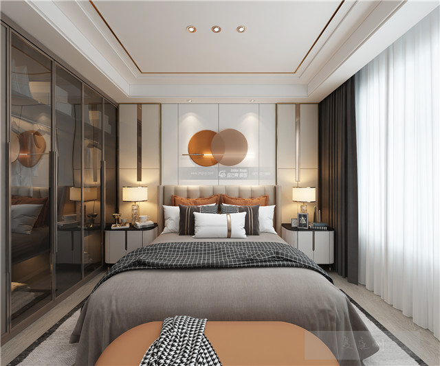 精致的灰玻和金屬線條,打造氣質滿滿的臥室空間,優雅又溫暖的配色,讓臥室溫馨感十足,床頭的輔助的光源配合玻璃和輔助光源,高級氣質的感覺盡顯。