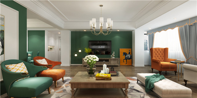 綠色的電視背景墻充滿個性,美式家居摩登中的復古最是迷人,彰顯奢華的高級感。