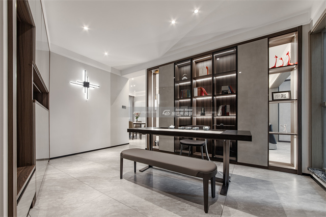 書房,原本戶型是一個不規(guī)則的地方,通過設(shè)計師的改造利用后變成了獨有的造型,柜子兩邊做了隔而不斷的展示柜既增強了書房的采光通風(fēng)性能又增強了與客廳的通透性。
