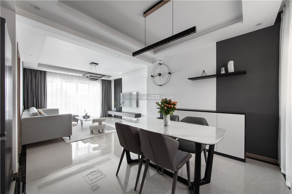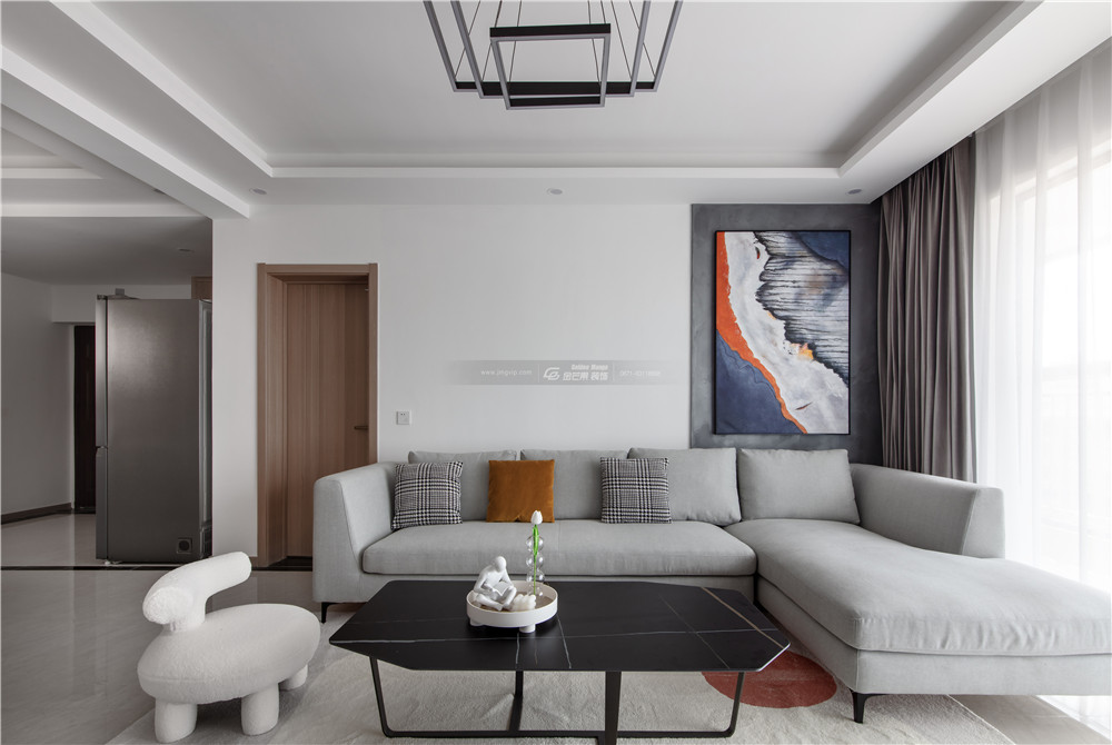 本套昆明裝修現代風格案例采用現代風格經典色系黑白灰,白色墻體使空間看起來更加干凈通透,黑色小桌搭配灰色沙發加以淺灰色地磚,使整體空間更顯沉穩,搭配跳脫的裝飾畫,使空間更顯靈動。
