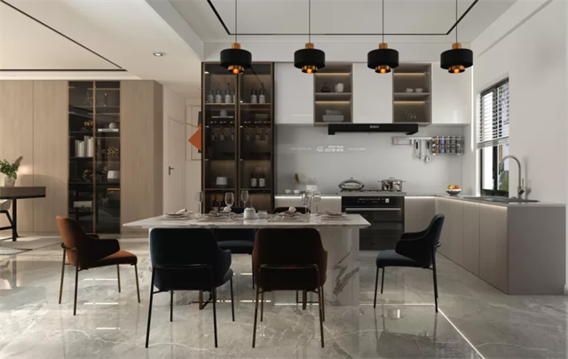 開放式的餐廳,大膽的不對稱柜體設計加之餐桌和獨特隆重的燈飾及利落的百葉窗,耐看經典。