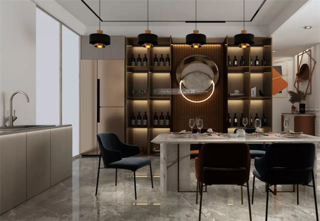 餐廳柜體多種材質相互拼接,加之圓形飾品燈圍質感驟然體現,左側的亮面柜成了墻前的點睛之筆。