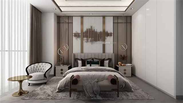 臥室突兀的墻柱,在床頭背景的豎條設計,飾品裝點,和搶眼的軟式家具布局下,和對稱的同色亮柜,所用材料用心有力。