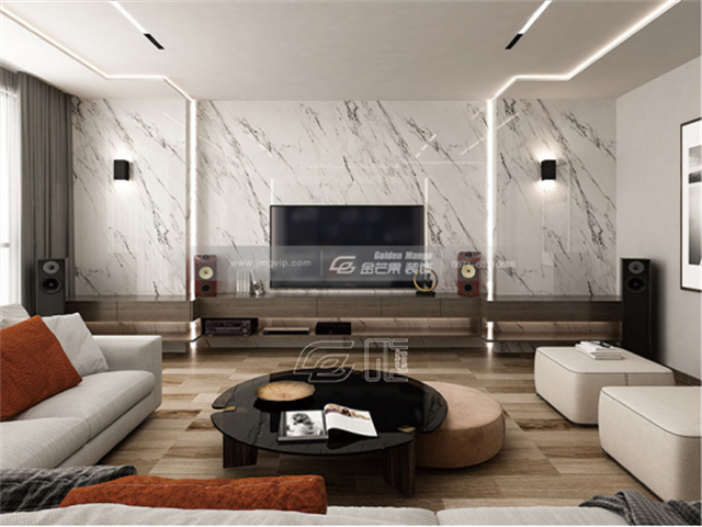 在客廳的設計上大膽運用軟裝和硬裝的結合,營造舒適、寬敞的體驗。地板材料使用木質的地板,更加有品質,在實際的使用體驗上也有強烈的反饋。舒適的休閑沙發也是疲倦時的一大支撐,大理石的電視背景墻更顯雅致、美觀。四個音響的配置,享受著影音的最大魅力,落地窗在整體寬敞、明亮的這一感受中顯得尤為重要,美觀實用的燈帶代替主燈設計。