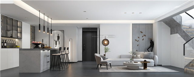 灰色電視背景墻搭配圓弧的造型,高冷中不乏溫柔的情調。清透的樓梯和玻璃和旁邊吧臺的情調形成鮮明的對比,展現冰與火的空間碰撞,空間變得多變起來。電視背景墻旁邊的亮色材質,讓空間變得亮眼了起來。