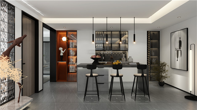 光影和高級的黑色,紅色渲染優雅的情調,讓吧臺變得富有優雅的情調,讓家居色彩變得更加豐富,空氣中仿佛都是紅酒的香氣。