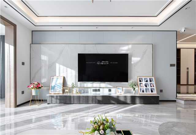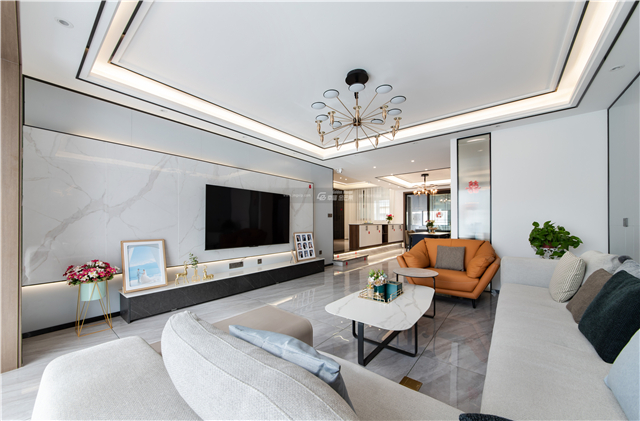 電視柜和茶幾等采用簡潔的造型增加空間氣質(zhì),電視背景墻增加燈帶營造氛圍感。
