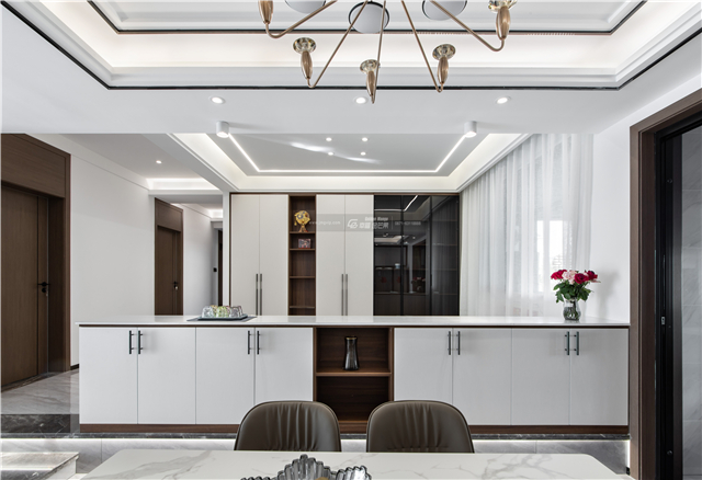 餐桌旁柜體,既可作為區(qū)域間的間隔,也為開闊的空間多增加了一些收納和休閑品茶的功能。