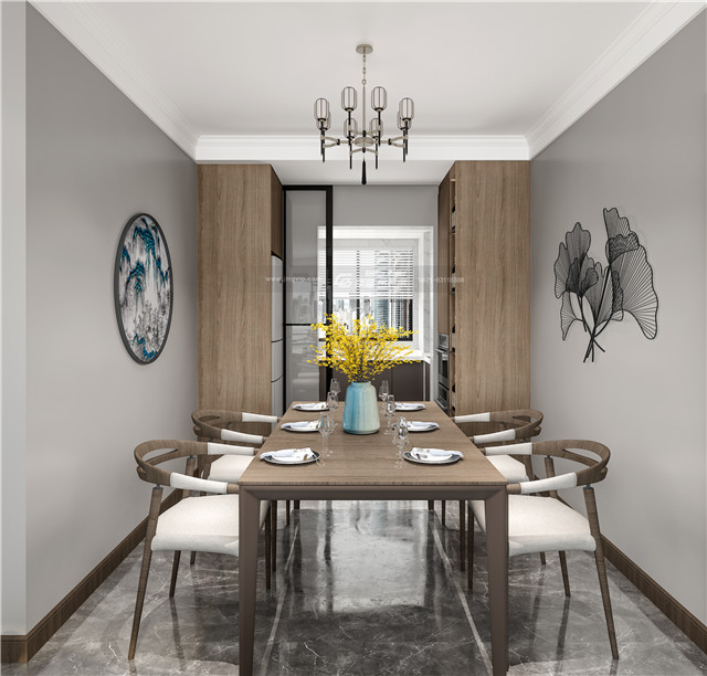 水墨青山,貴氣自現,中式的餐桌椅迎合空間的格調,展現非凡的氣度。