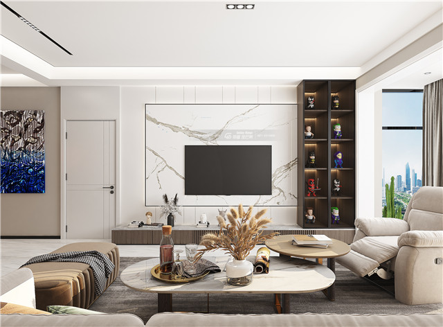 在簡約優雅的暖色空間中,水異型燈、白色、大理石、公仔展示的運用下,