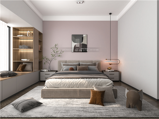 暗粉色的墻面少女感十足,同時醞釀空間的優雅氛圍。加上一縷植物,清新又純粹的感覺。飄窗選用木材,加上溫暖的燈光,更增加溫暖感。
