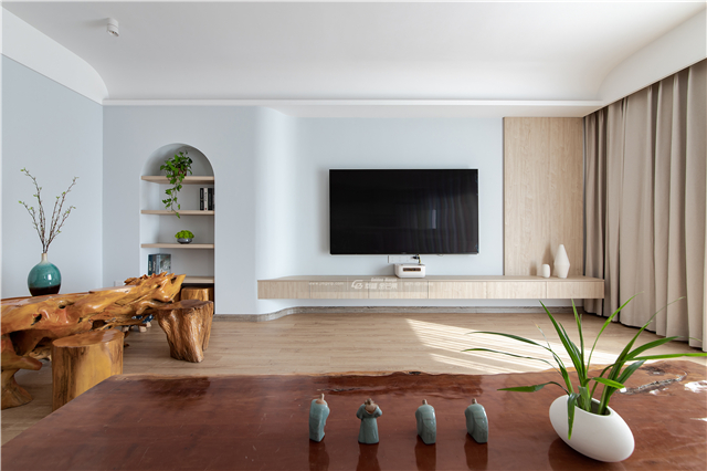 電視背景墻旁的壁龕設(shè)計(jì),點(diǎn)綴幾株清新的綠植,有弧度的墻面,曲折流轉(zhuǎn)間,仿佛走進(jìn)了森林里的小路,清新而充滿趣味。