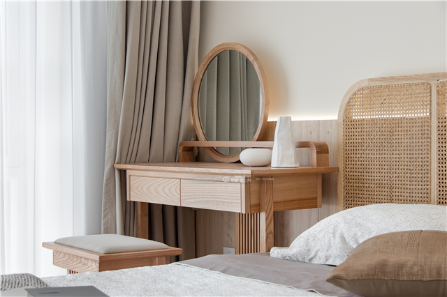 純白的紗簾是原木家具的絕佳伴侶,陽(yáng)光透過(guò)一片純白在木地板上投下斑駁的影子,暖融融輕飄飄,身心都變得慵懶而輕盈起來(lái)。