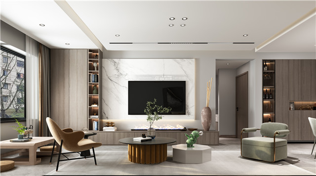 無(wú)主燈設(shè)計(jì)搭配可移動(dòng)燈軌,營(yíng)造空間氛圍感。大理石電視背景墻加木質(zhì)柜體,軟硬兼容,層次感更加豐富。現(xiàn)代感十足的茶幾和單椅,追逐時(shí)代潮流。
