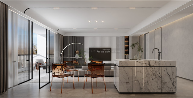 石材本身的冰冷高級感賦予空間更多的品質,亞克力板餐椅精致又有格調,光影流轉間一切都變得更有華美感和儀式感起來。