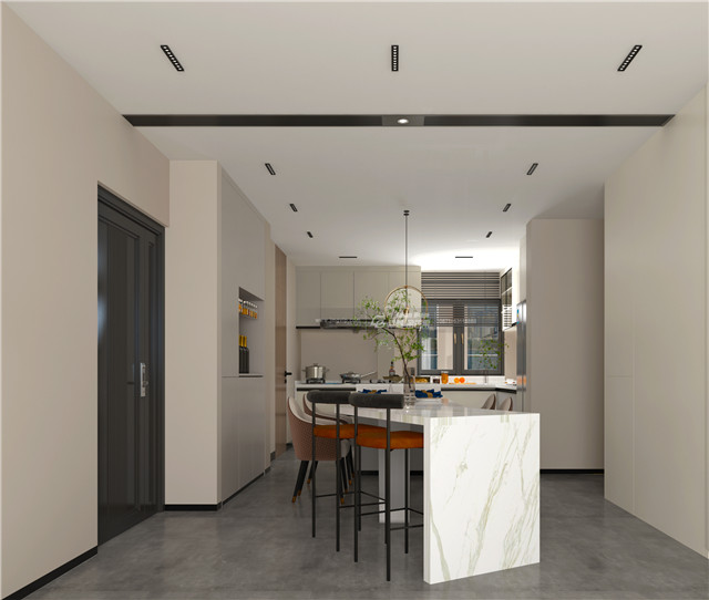 將餐桌和吧臺結合在一起,空間更具造型感。中間設置島臺,同時滿足中西廚烹飪需求。精致的大理石臺面提升空間氣質感,在清爽簡潔的氛圍下更顯干凈利落。