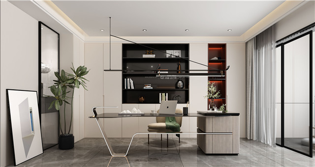 開放式書房,黑色的柜體讓視線有了重心,紅色柜體的點綴下,空間變得穩重起來。造型簡約的茶幾,用幾何形狀表達著空間的利落與造型感。