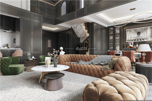 柔軟溫暖的沙發(fā),簡(jiǎn)約的家具和優(yōu)雅的造型,氣質(zhì)感滿滿,柔軟的地毯帶來(lái)舒適慵懶的觸感,摩挲著腳掌,緩緩傾訴著屬于這種暗黑系大宅的迷人魅力。