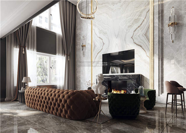 挑高的電視背景墻用大理石做背景,簡(jiǎn)約時(shí)尚,氣度非凡。一盞華麗的燈飾更將空間的氣度拉升。電子壁爐升起溫暖的火焰,橘色沙發(fā)、綠色單椅將空間溫暖的氛圍承托得恰到好處。