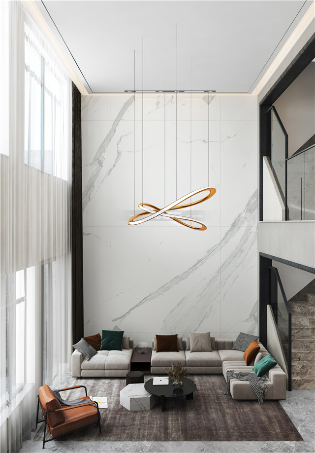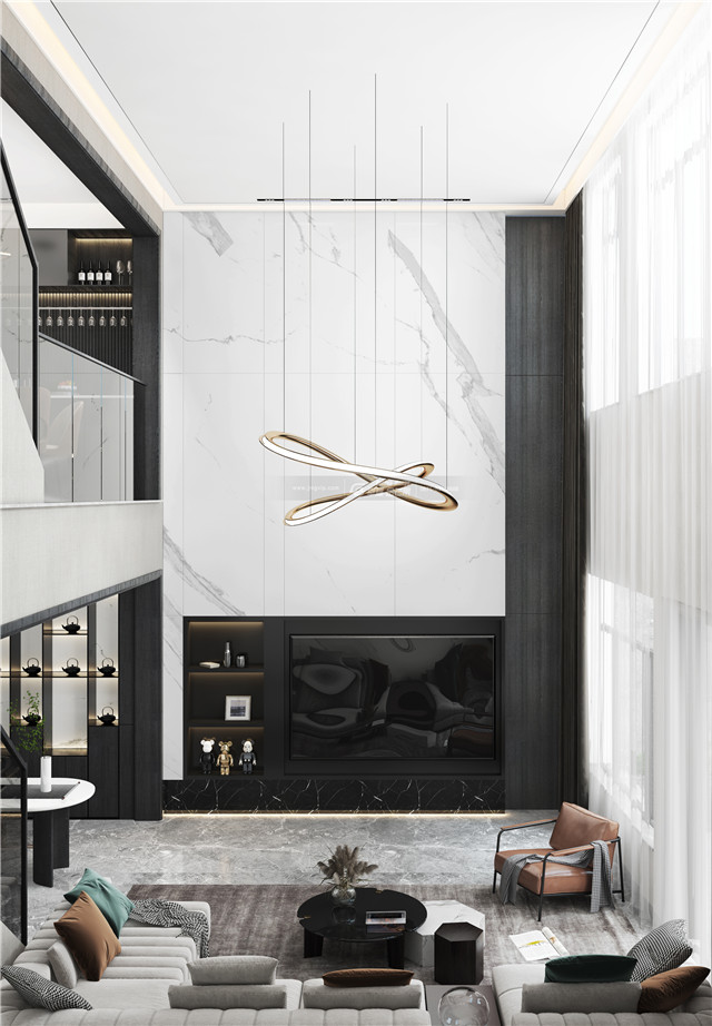 簡約的大理石電視背景墻垂直瀉下,屬于大宅的別樣氣度展現出來。簡約的色調讓原本寬敞的空間更顯通透。經典的黑白灰搭配詮釋著經典不過時的美感。