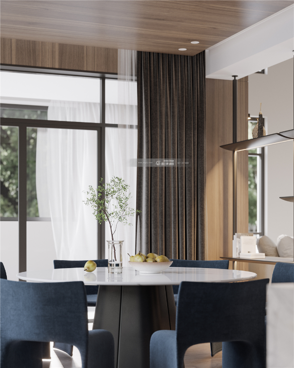 餐廳區(qū)域,桌椅采用暗色系,淡化物質(zhì)存在感,注重品質(zhì)的彰顯,強(qiáng)調(diào)精神內(nèi)在的平靜與安寧。大理石餐桌臺面,更符合意式風(fēng)格定義,傳達(dá)個性與時尚藝術(shù)的魅力。