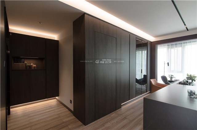 門、矮柜、門套選用高級(jí)整木定制,大面積定制柜體和墻板,便有了呈現(xiàn)出來(lái)的顏色和諧統(tǒng)一的效果,空間感更佳。