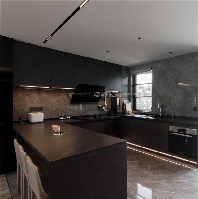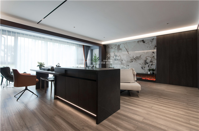 一個(gè)人獨(dú)處的空間,設(shè)計(jì)規(guī)劃也可以任性一些。吧臺(tái)和定制酒柜,正好呼應(yīng)客廳交友聚會(huì)的需求。