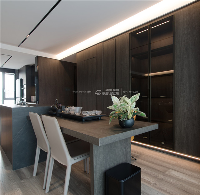 享受獨(dú)處帶來(lái)的安逸舒適,明先生也喜歡幾多好友聚在一起聊天交心的時(shí)光,于是客廳里就有了這個(gè)茶桌和調(diào)酒臺(tái)。中式茶韻,西式情調(diào),滿足明先生不同的社交方式。