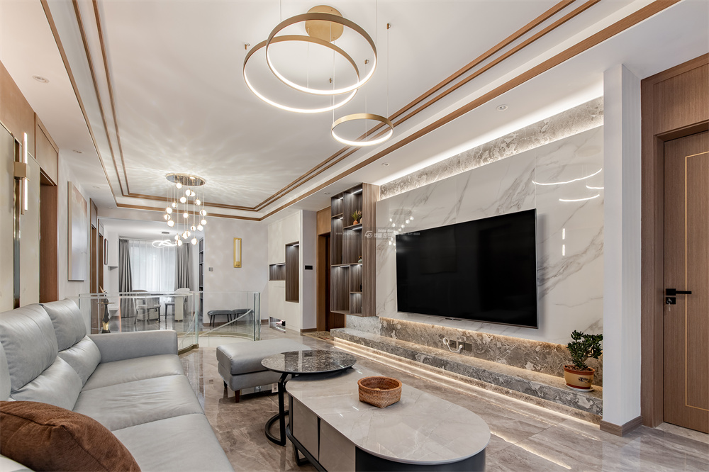 摒棄傳統的電視柜造型,用大理石加燈帶的處理,護墻板后安裝燈帶,相互輝映打造優美的光影效果。是打動人心的溫暖,是別具一格的華麗。
