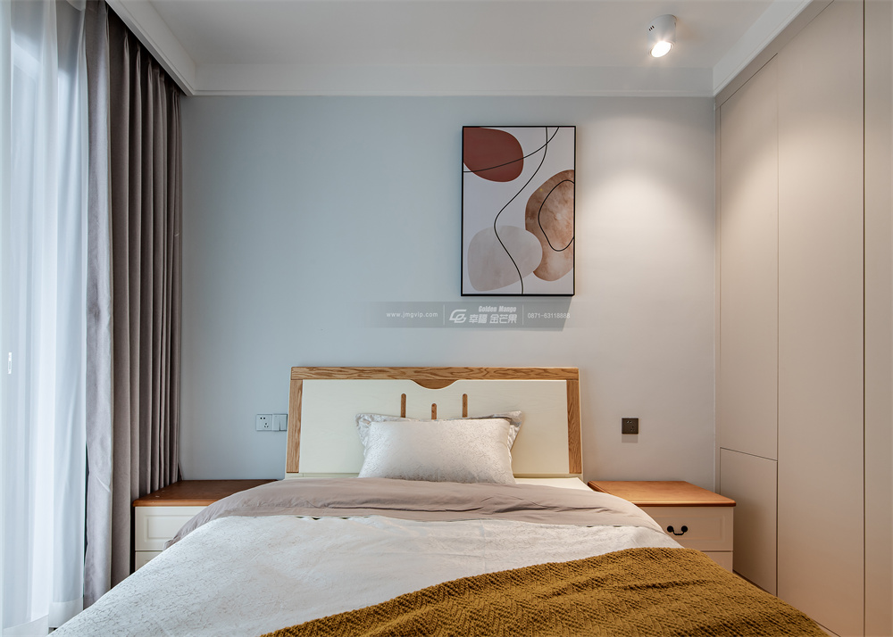 主臥以灰白為主,沒有過多的裝飾,純色乳膠漆墻面+無主燈設計,放大空間視覺感。