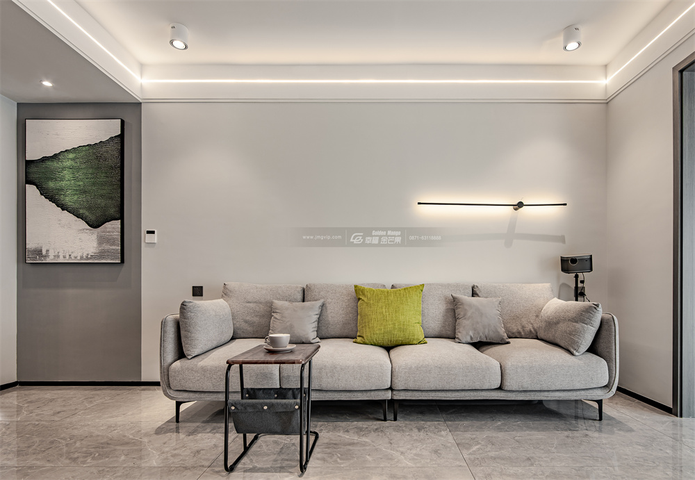 沙發背景墻大面積留白,顯得整體簡潔大方,灰白色的棉麻沙發搭配一個亮眼的綠色抱枕,讓空間增添一絲靈動和活潑。