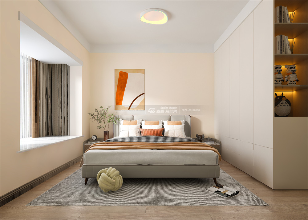 主臥簡約舒適的家居布置下,空間自帶輕松氛圍,橙色元素的點綴,提亮空間整體色調(diào)。熱情洋溢的愛馬仕橙與沉穩(wěn)低調(diào)的灰白色系搭配,兩者融合得不會讓色彩太炸眼,冷暖交融,平衡過渡得剛剛好。