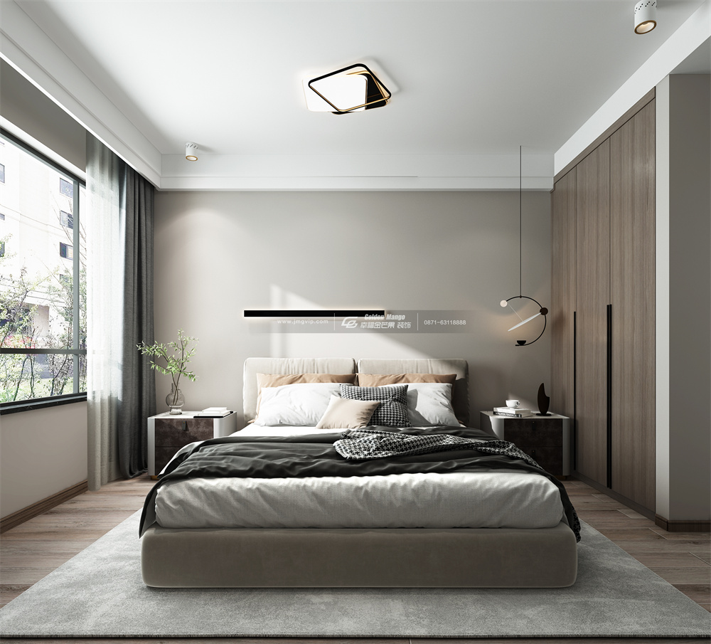 次臥采用“輕裝飾”原則,簡單的床頭柜背景墻搭配嵌入式衣柜,達到臥室配置上的精致實用,也不會占用臥室的中心空間。