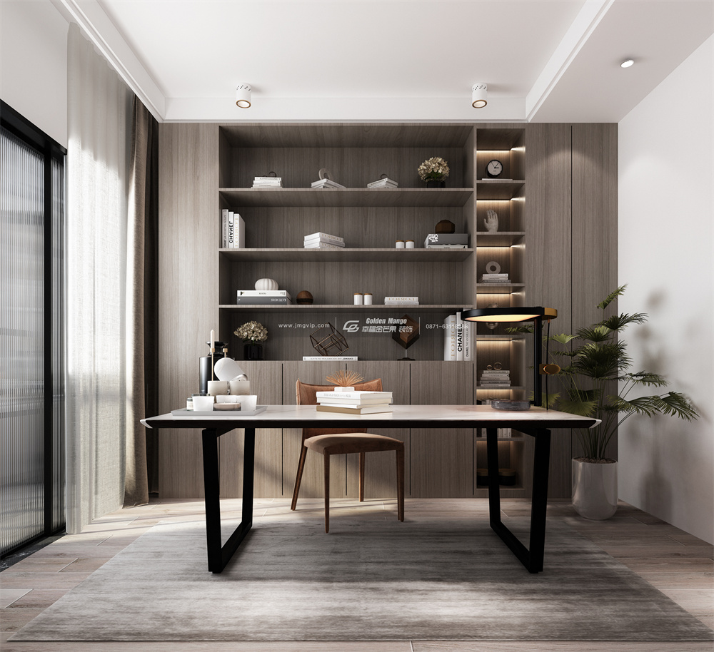 極簡風的書房,現代風十足,原木定制大氣有檔次。極簡風格的木質紋理,彰顯書房的沉穩低調氛圍。這樣的氛圍下,一杯茶,一本書,一片溫暖的陽光,一段悠閑的時光,足以慰藉工作生活中所有的壓力。