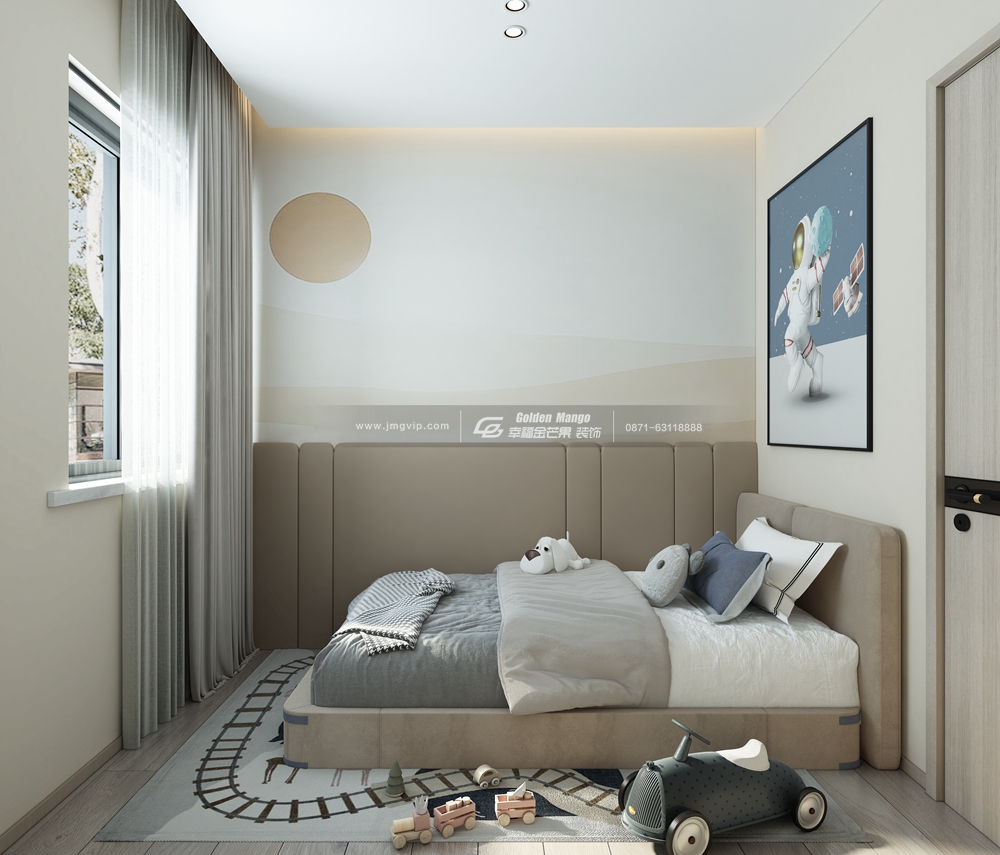 男孩房以時(shí)尚的淡藍(lán)色和灰色為主,設(shè)計(jì)上采用多種元素,汽車(chē)、火車(chē)、航天、太空,搭配充滿(mǎn)童趣的軟裝,為孩子定制一個(gè)造夢(mèng)空間。