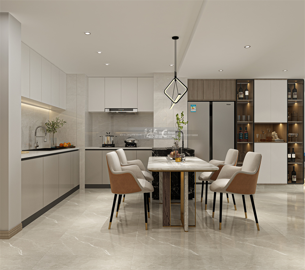 餐廚區(qū)簡約大氣,一體化設(shè)計,方便日常生活;就餐區(qū)和中島吧臺合二為一,給廚房留出更多空間,高低臺一體裝修設(shè)計,方便又實用。