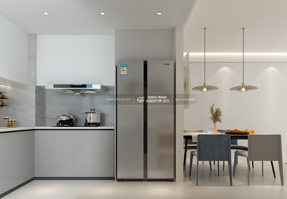 廚房L形設計布局流暢,方便日常烹飪操作,沿墻面設置吊柜壁櫥,充分的收納空間使得廚房物品井然有序,看著心情就好了起來;餐廚區域的半開放設計好像連接起了兩個世界,一邊忙碌于三餐四季的煙火氣息,一邊脫下疲憊享受家的美味,平淡美好,足慰此生。