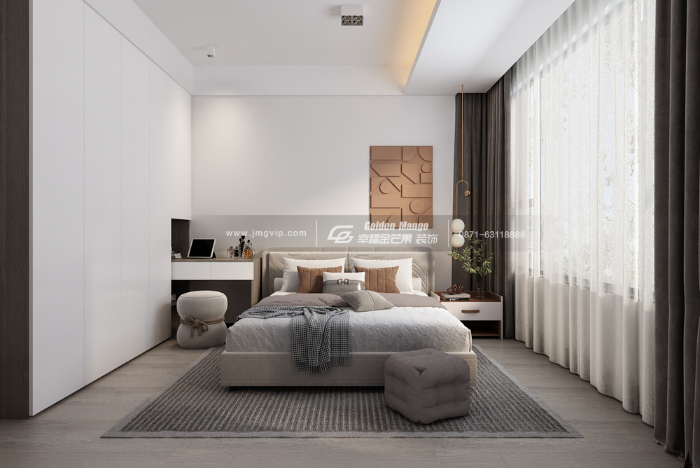 次臥色調深沉,簡約而不簡單,精致又耐看。仿佛這是一個靜者空間,適合深思生活的意義,清逸淡雅,當太陽爬上山崗,自然光透過窗戶洋洋灑灑地照射進來,柔軟又平靜,一派歲月靜好的模樣。