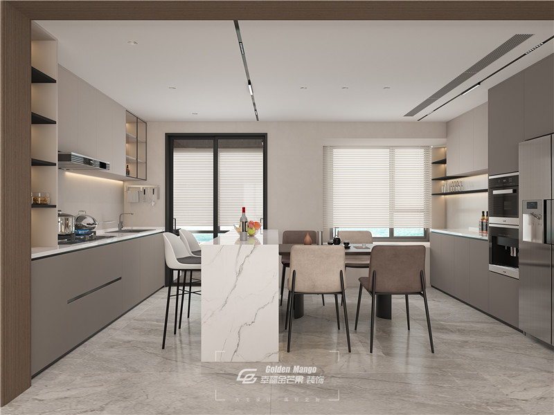 家是屬于自由的,空間也是。開放式的布局,一側(cè)是中廚空間的煙火寥寥,另一側(cè)是西廚空間的滿滿情調(diào)。餐桌島臺置于其間,空間互相串聯(lián),動線順暢無拘。應(yīng)季時蔬,自在烹飪,最本真的味道里,是最幸福的家庭時光。