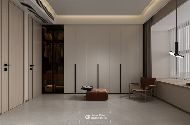 忙碌是生活的常態,選擇安放精致讓自己鮮活起來。床尾的衣柜以虛實結合的體塊感呈現出來,相異的色調在其間碰撞交錯,演繹靈動隨性之美。
