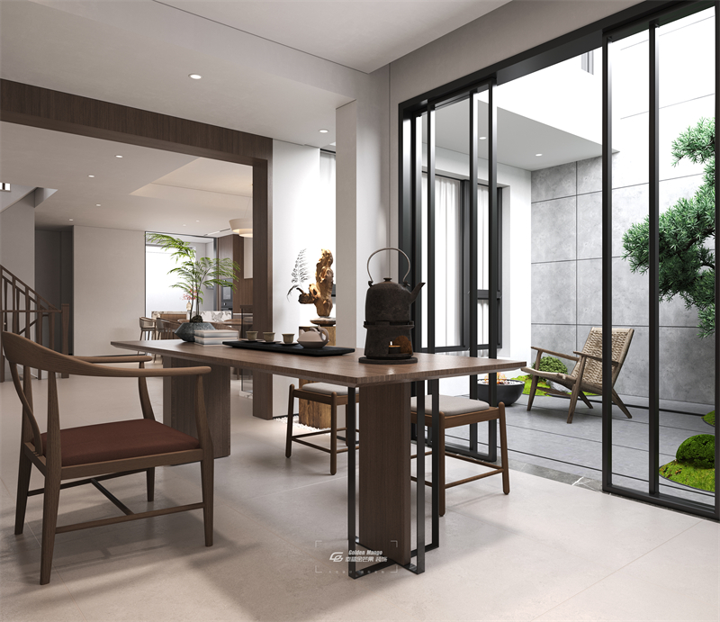 通透的玻璃門將窗外的景致裁剪成詩意的畫卷,讓自然的光影成為茶室中最靈動的裝飾。