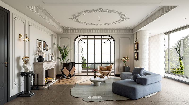 沙發(fā)后方的古典風(fēng)格壁畫,以細(xì)膩筆觸描繪著自然景致,瞬間拉滿藝術(shù)氛圍。墻面造型線條簡潔而富有韻律,勾勒出空間的層次感,盡現(xiàn)美式風(fēng)骨。