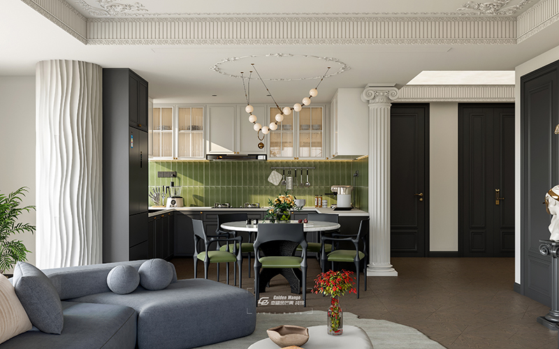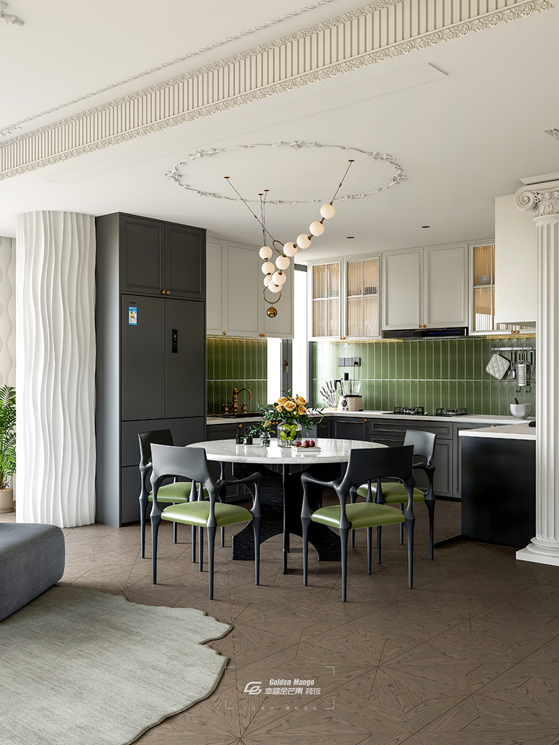 與客廳相連的餐廳區(qū)域,同樣別具風(fēng)味。圓形餐桌置于空間中央,搭配上黃綠色坐墊的餐椅,與廚房區(qū)域的綠色墻面相呼應(yīng),在色彩上達(dá)成巧妙的統(tǒng)一。餐桌上方,吊燈如璀璨星辰,灑下柔和光芒,營造出浪漫的用餐氛圍。