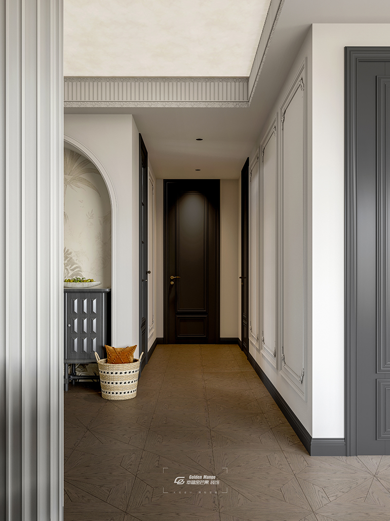 每到用餐時分,家人圍坐,美食飄香,溫馨的氛圍在空間中蔓延,讓日常的每一餐都成為生活的儀式。走廊:藝術(shù)的悠長回響走廊雖為過渡空間,卻被賦予了獨特的生命力。墻面的裝飾畫與線條造型,猶如跳動的音符,為歸家之路增添藝術(shù)韻律。地面紋理與整體風(fēng)格呼應(yīng),漫步其中,仿佛穿梭在藝術(shù)長廊,讓每一次歸家都充滿期待。